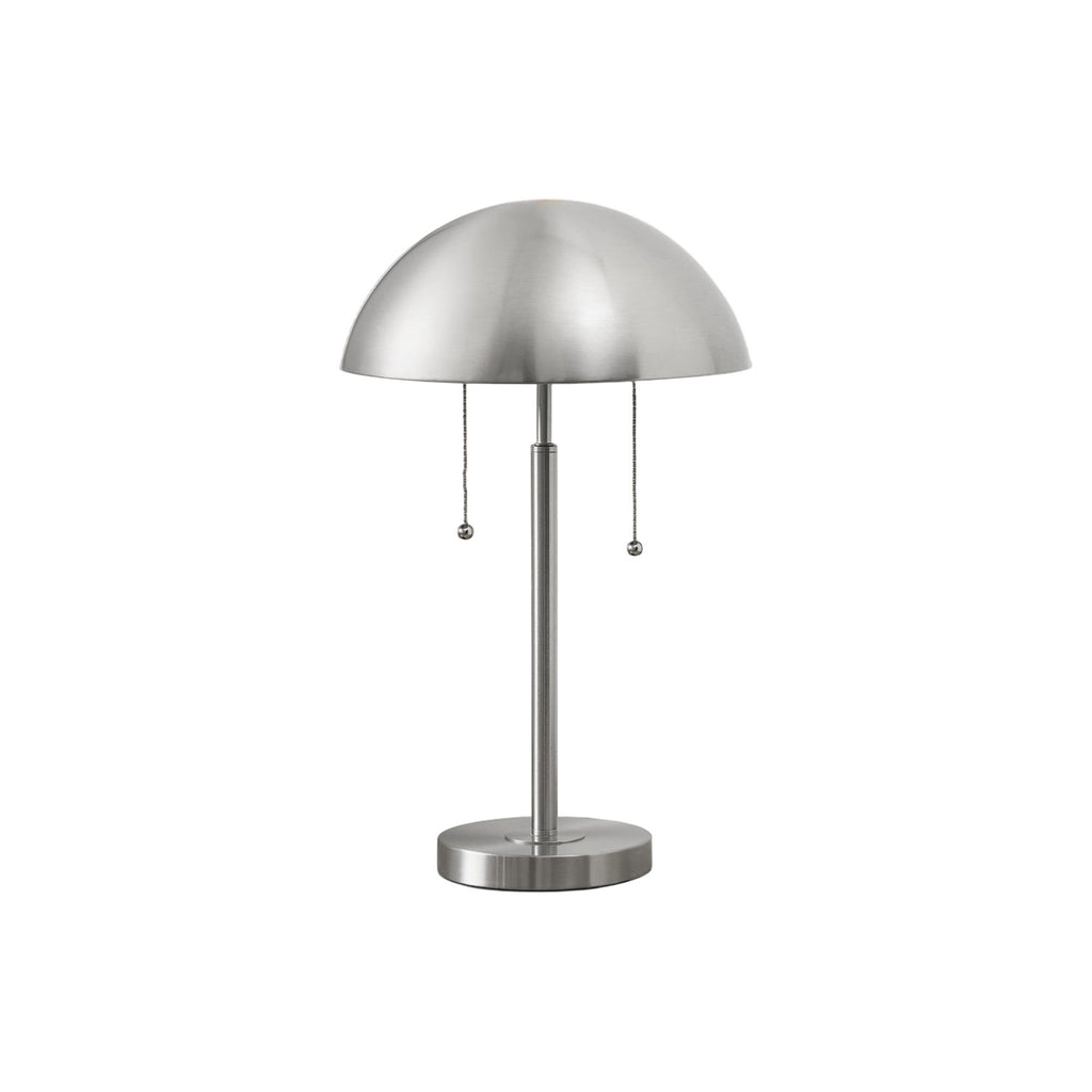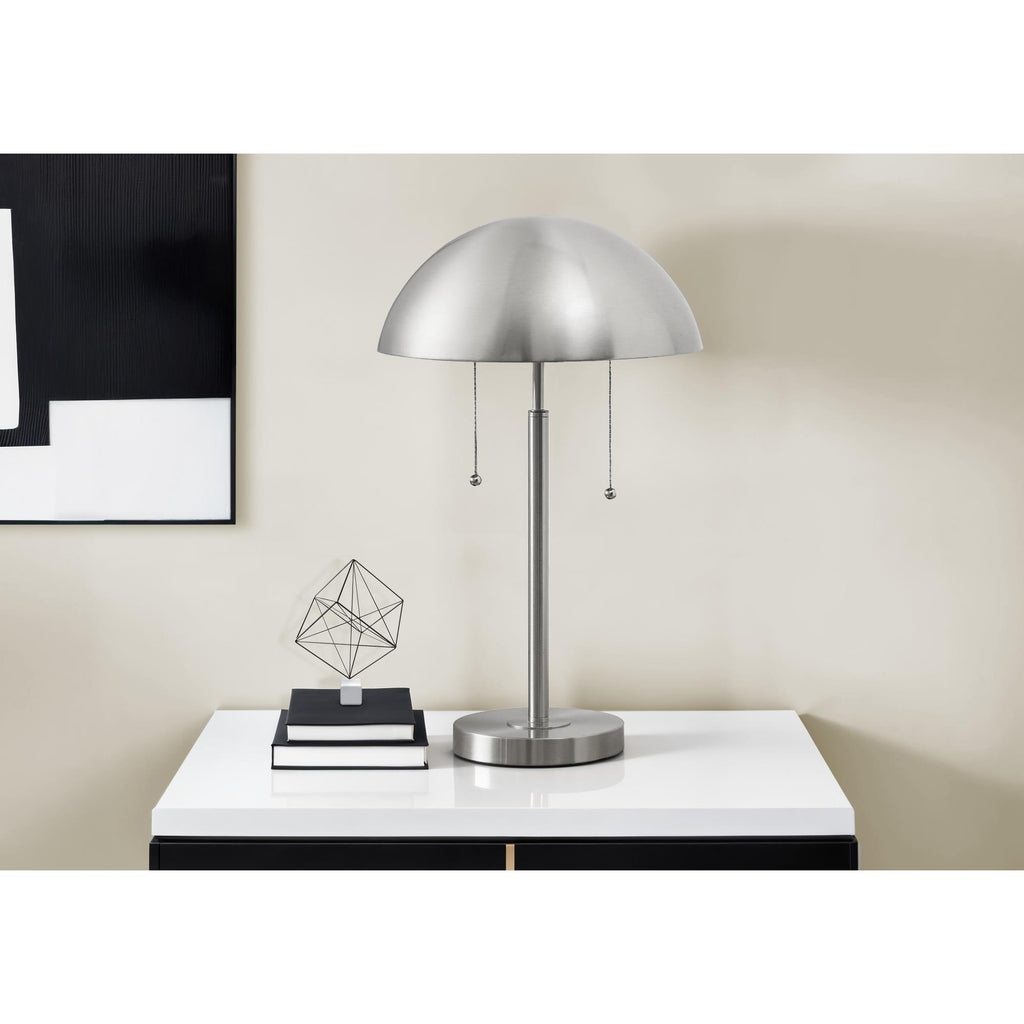 • Modernize your interior decor with this retro-inspired 20"h silver metal table lamp with a round base and a retro-inspired, mushroom dome shade, perfect for accentuating an end or side table, nightstand or console table.