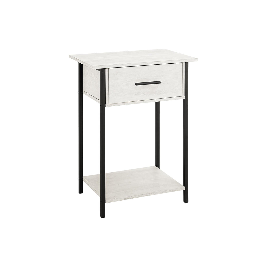 • This small, rectangular side table with a space saving design, features a convenient storage drawer accented with a black metal handle and a bottom shelf for storing and displaying a lamp, books, or decorative objects