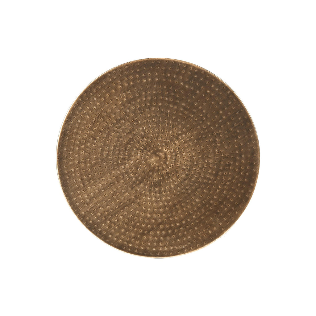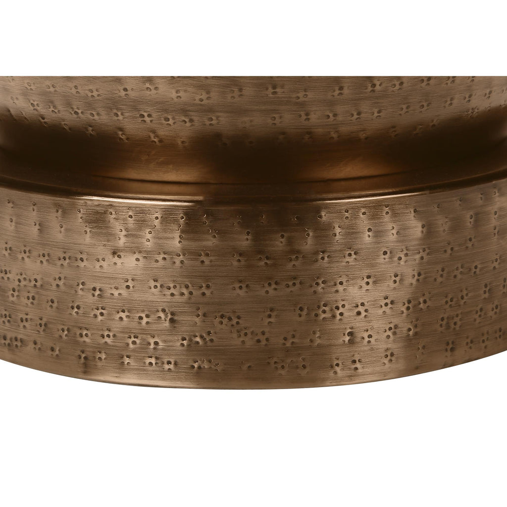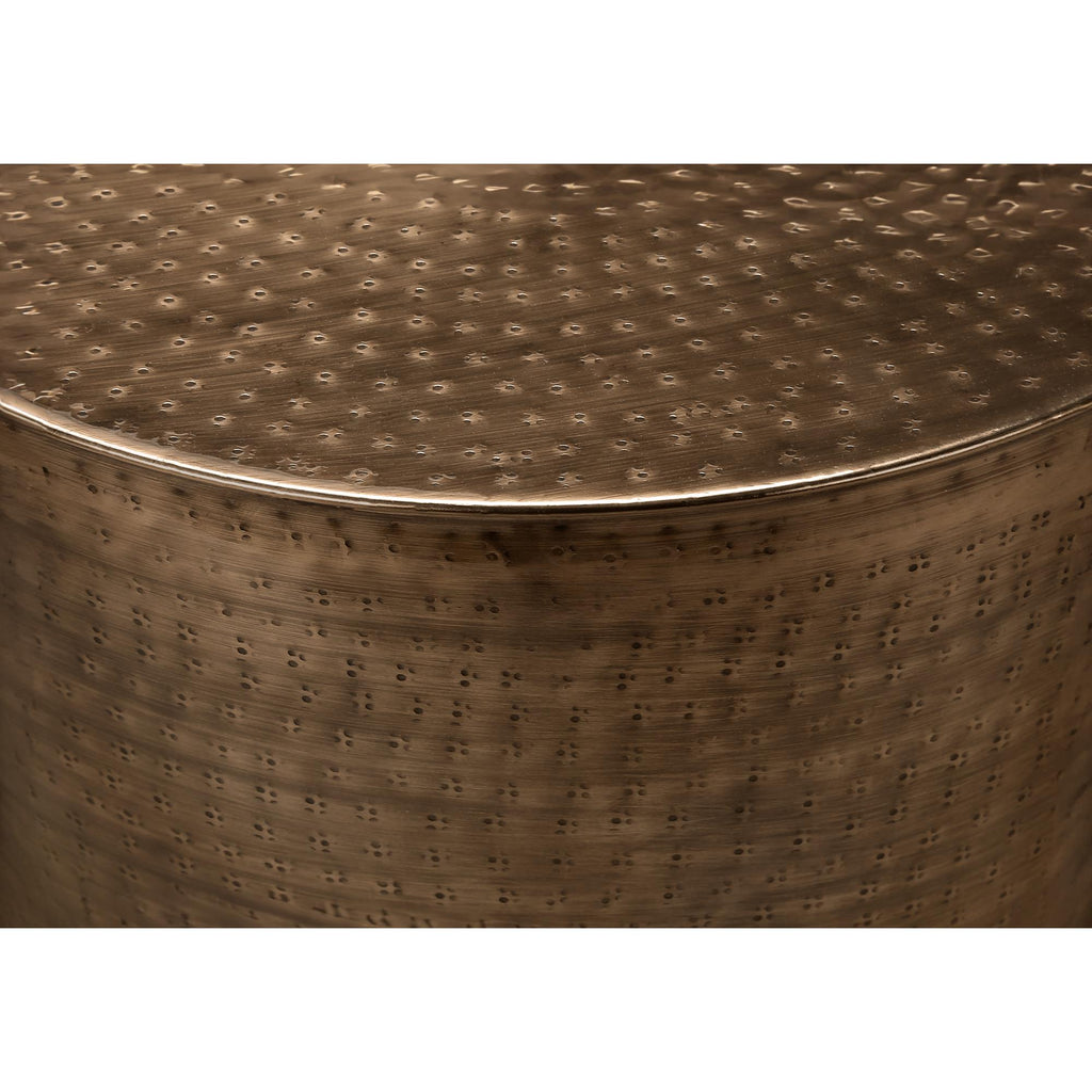 • This hand-crafted, 22" high metal drum accent table, sits on a sturdy, round pedestal base in a copper metal finish, with a subtle hammered-look all over for a boho-glam look in a living room or bedroom