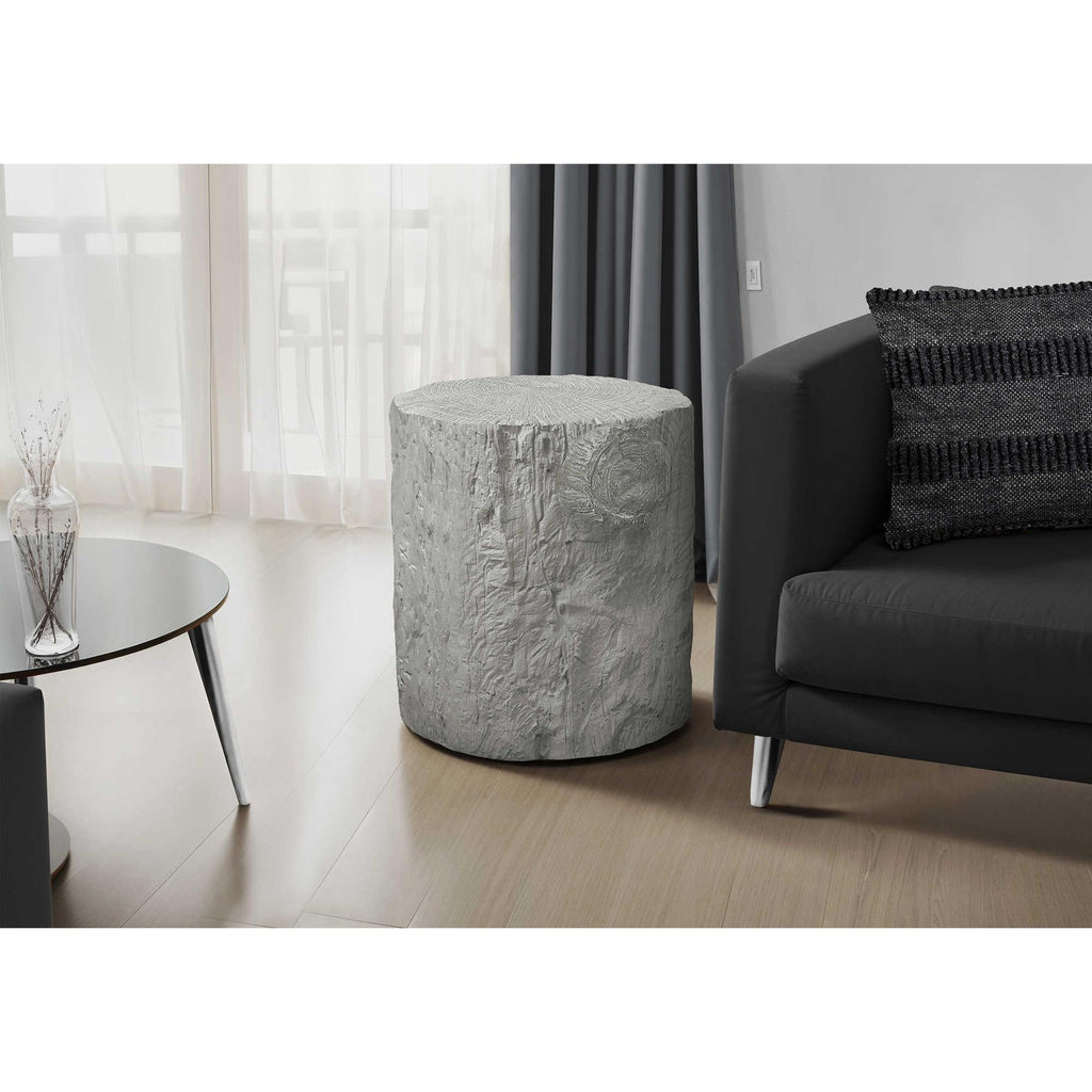 • Add a unique element to your living space with this 25"h round, grey accent table, expertly crafted in a stunning tree stump design that complements any indoor or outdoor contemporary setting