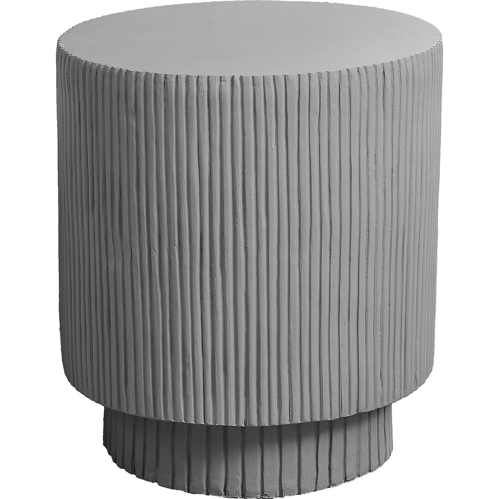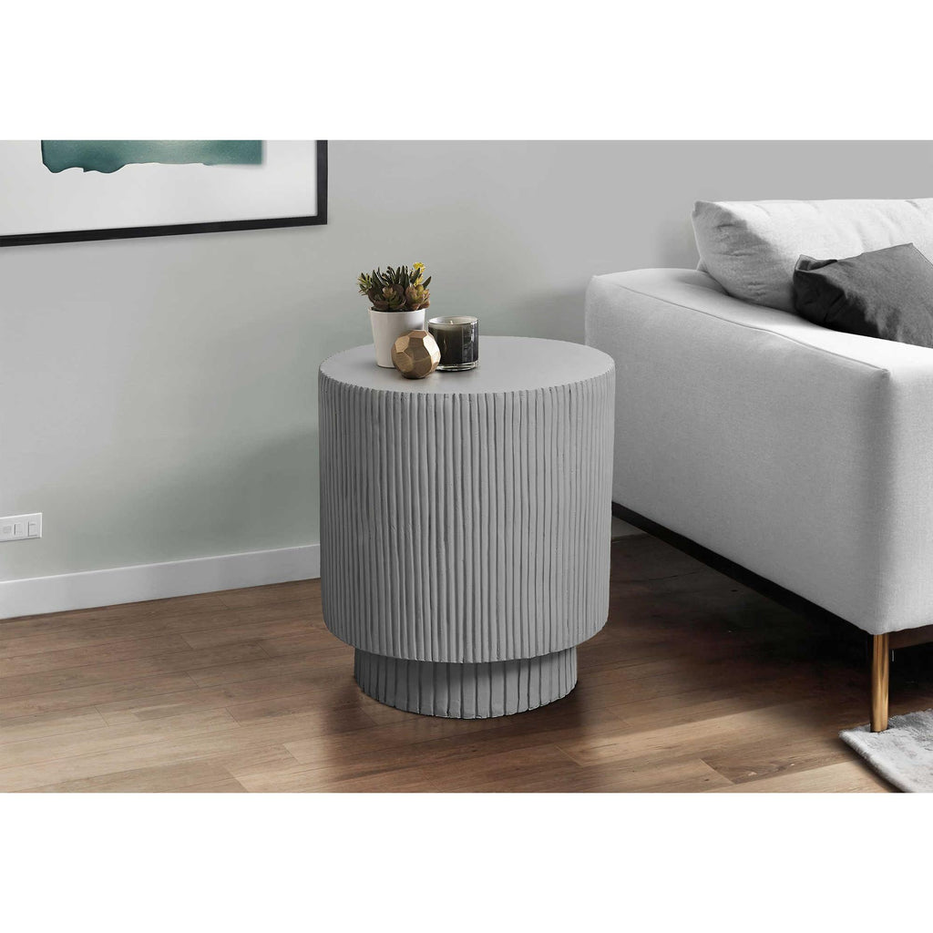 • This 25"h indoor or outdoor accent table in a chic grey finish boasts a contemporary ridged design, perfectly uplifting your living room, bedroom, or patio space with modern elegance