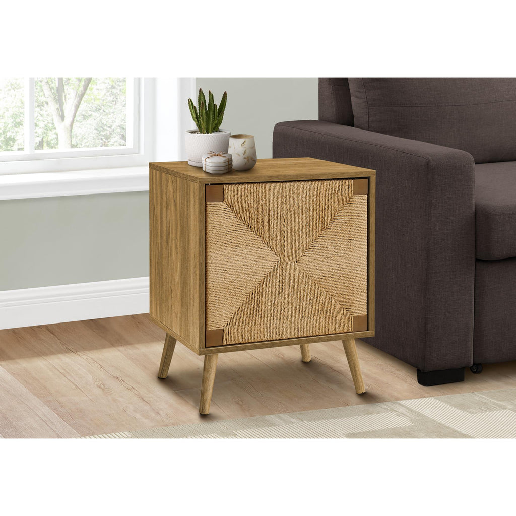 • Modern, mid-century inspired 23 inch high side accent table in a trendy light walnut laminate finish and complimented with a hand-crafted, natural seagrass door, bringing fashionable style to your living room