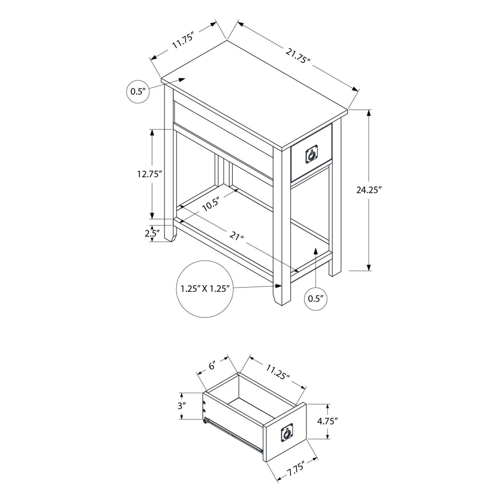 • Features a storage drawer with a bronze metal pull and a bottom shelf for extra organization and a space saving design