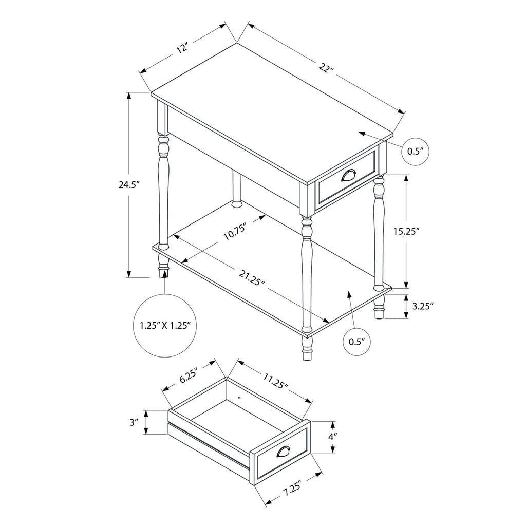 • Practical for small spaces with its narrow design, place it as an end or side table next to a chair or sofa in the living room, or as a simple nightstand to bring some traditional elegance to your bedroom