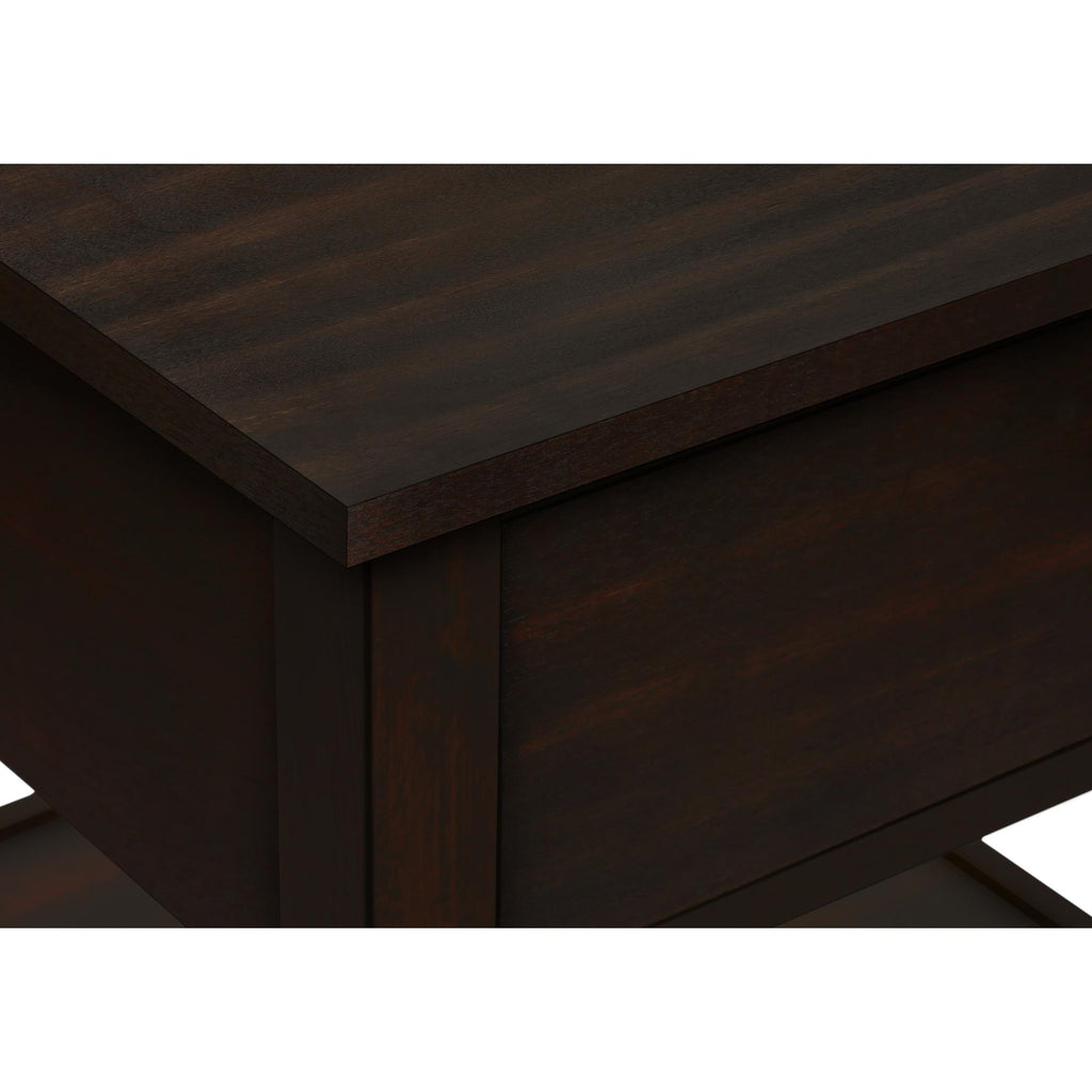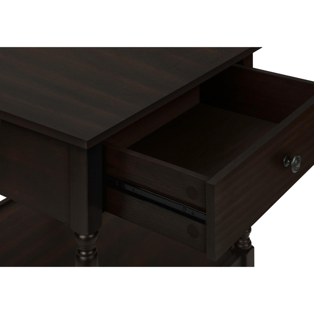 • The 2-tier design provides ample storage and display space for a lamp on top, a spacious drawer complimented with a classic bronze metal knob, and a bottom shelf for books or decorative objects