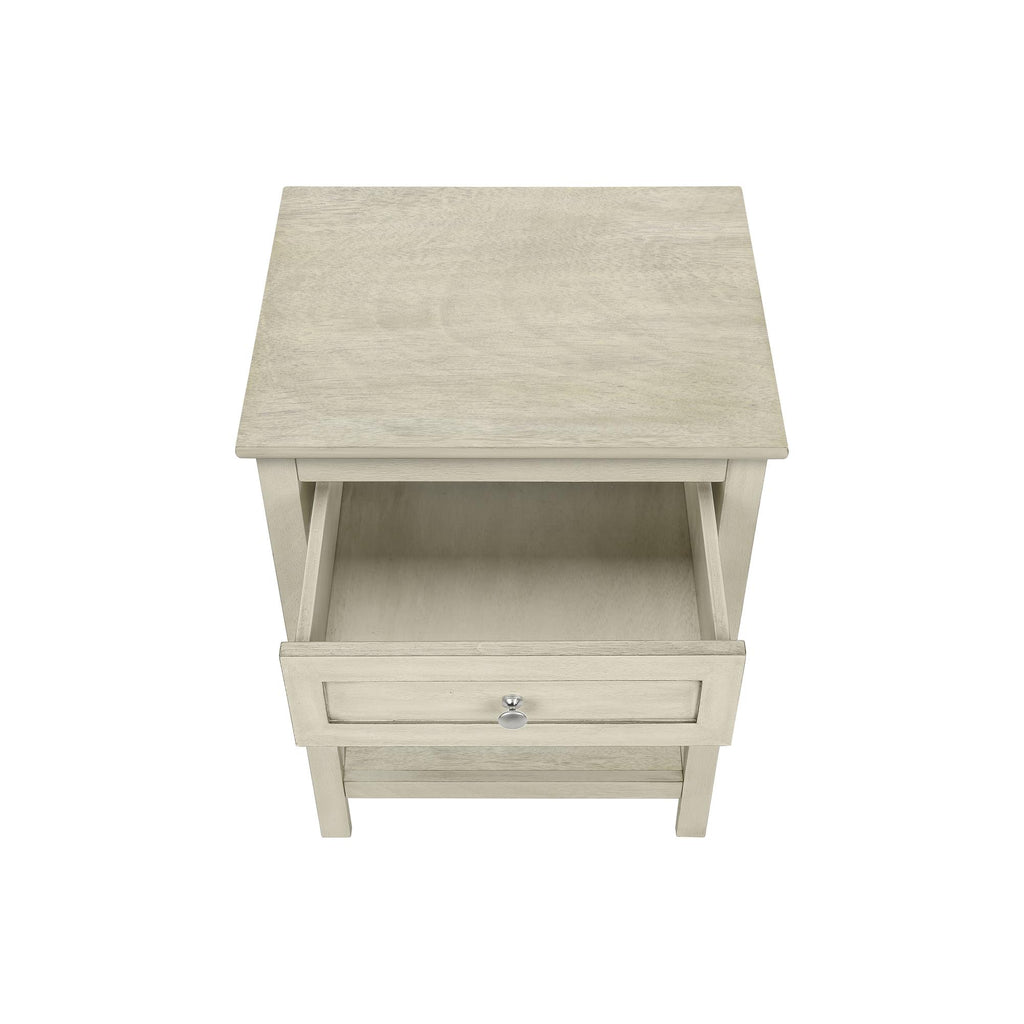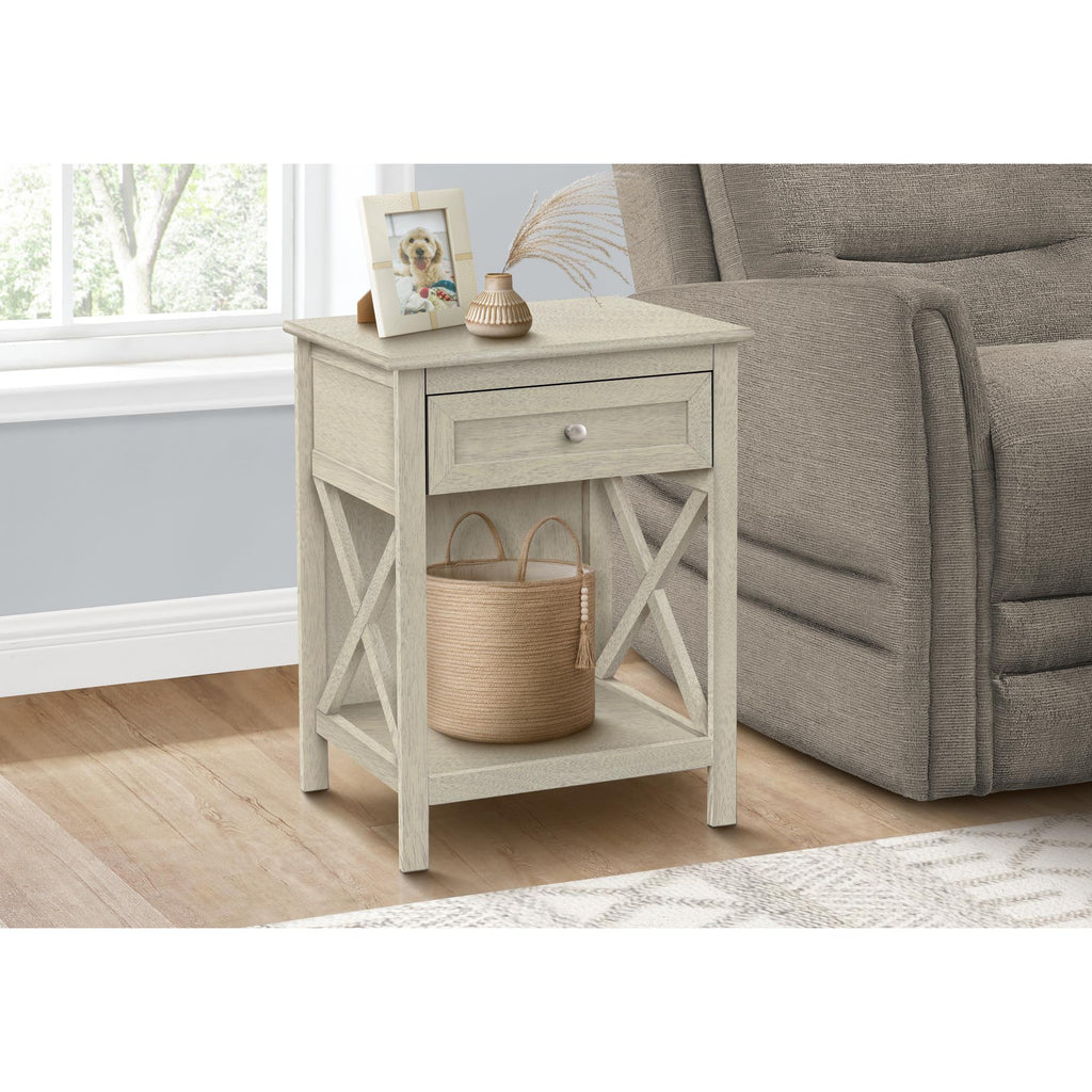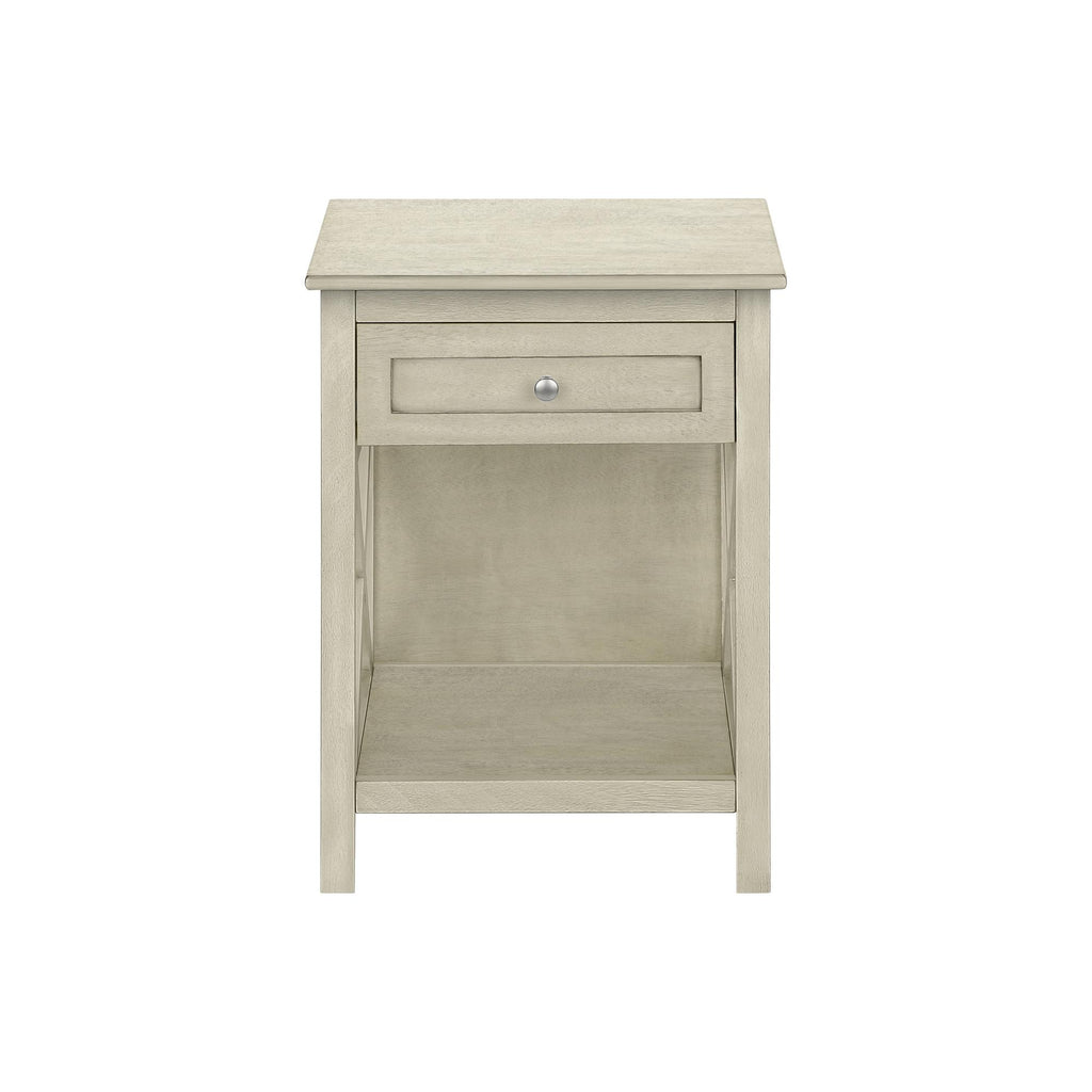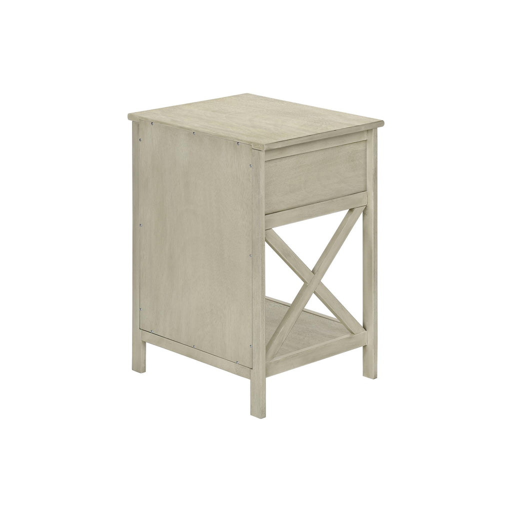 • This transitional style, 2-tier accent table in a trendy antique white veneer finish, complimented with an x-design on each side is a practical space saving solution for any room in your home