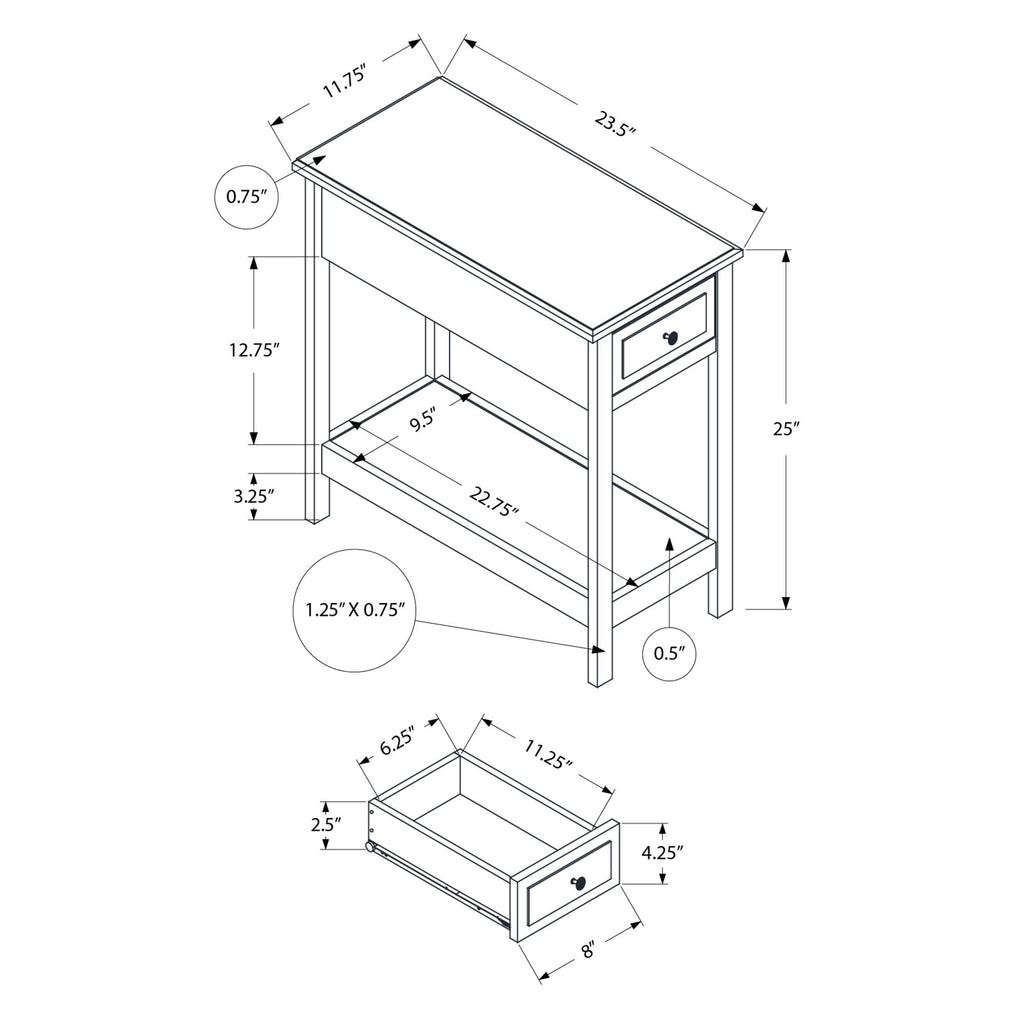 • Features a handy storage drawer with an elegant bronze metal knob to store small essentials within reach, and a bottom shelf for extra displace space