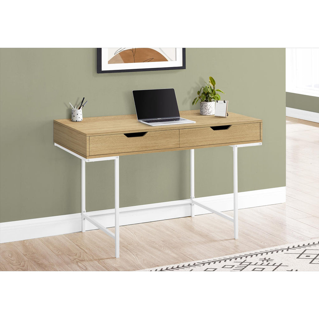 • Computer desk in a natural finish with 2 storage drawers featuring wide, cutout handles and metal drawer slides