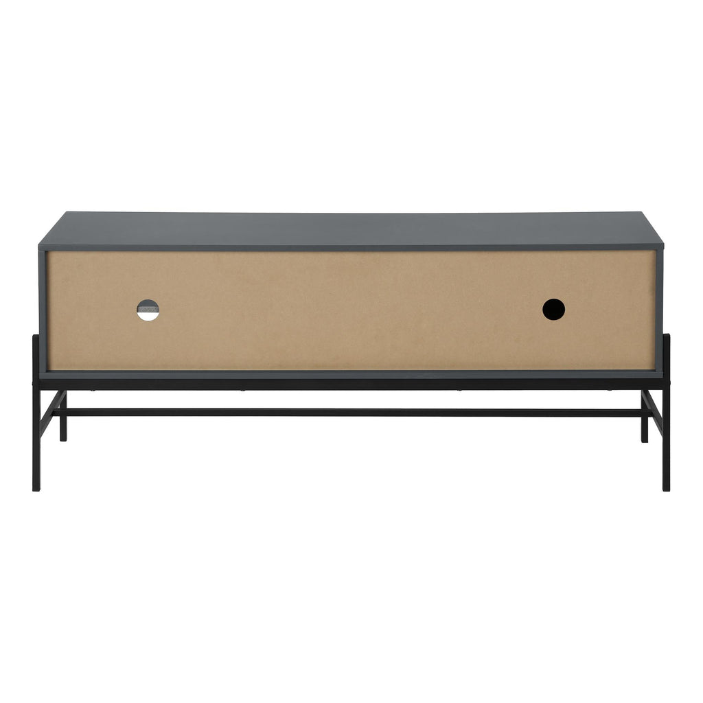 • This fashionably stylish 60 inch contemporary tv stand is solidly constructed with grey laminate and black metal for a modern statement in a living room, bedroom, or office