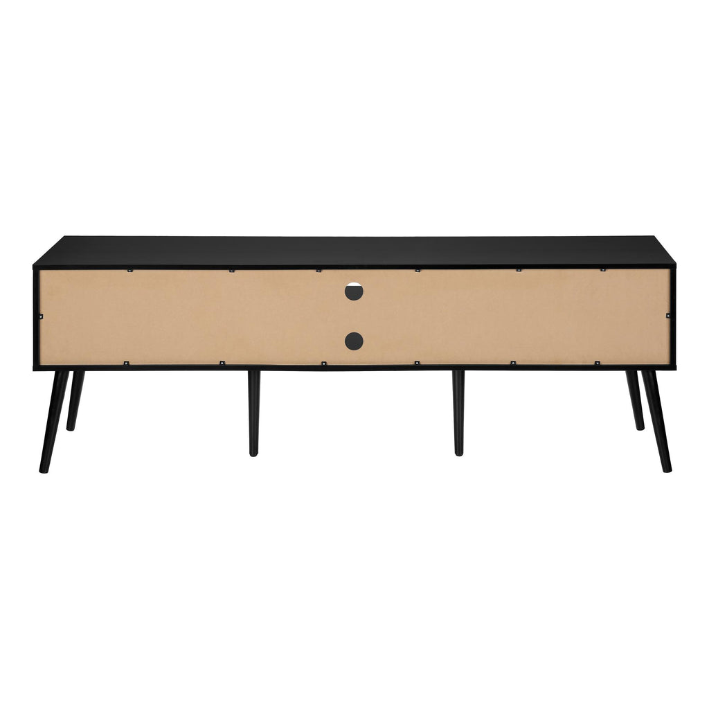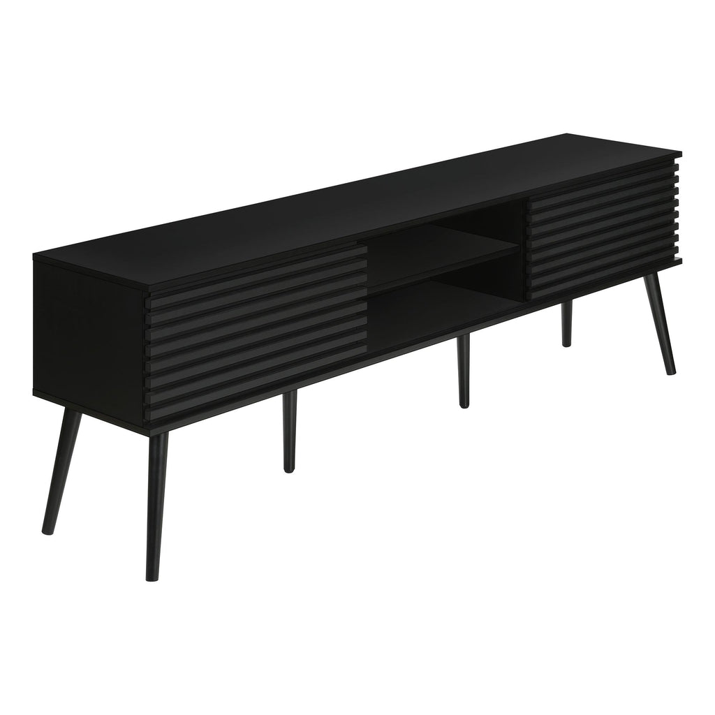• This solidly constructed, contemporary 72 inch tv stand with a sleek black laminate finish on all sides is perfect for trendy living rooms or bedrooms