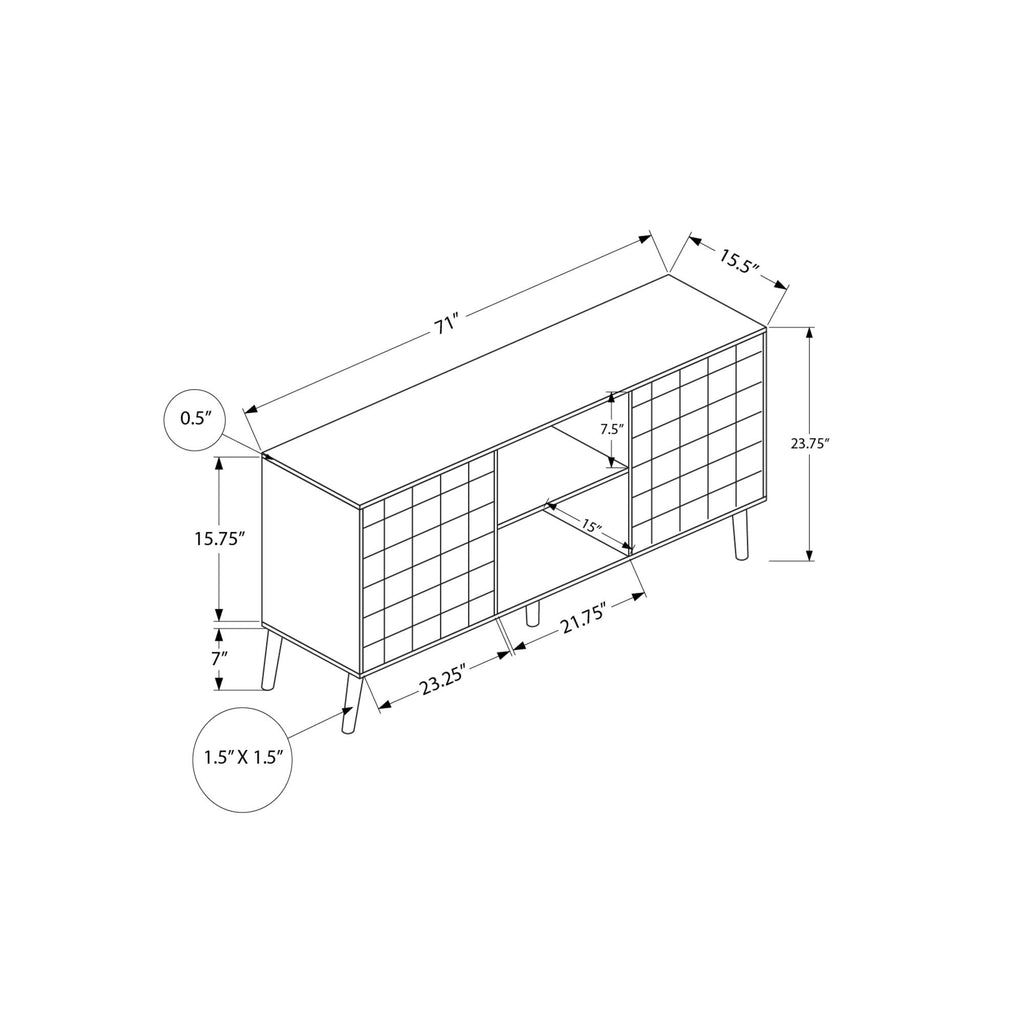 • Trendy 72-inch long tv stand in smooth walnut laminate finish with a mid-century flair, perfect for an upgrade to a living room, family room, or bedroom