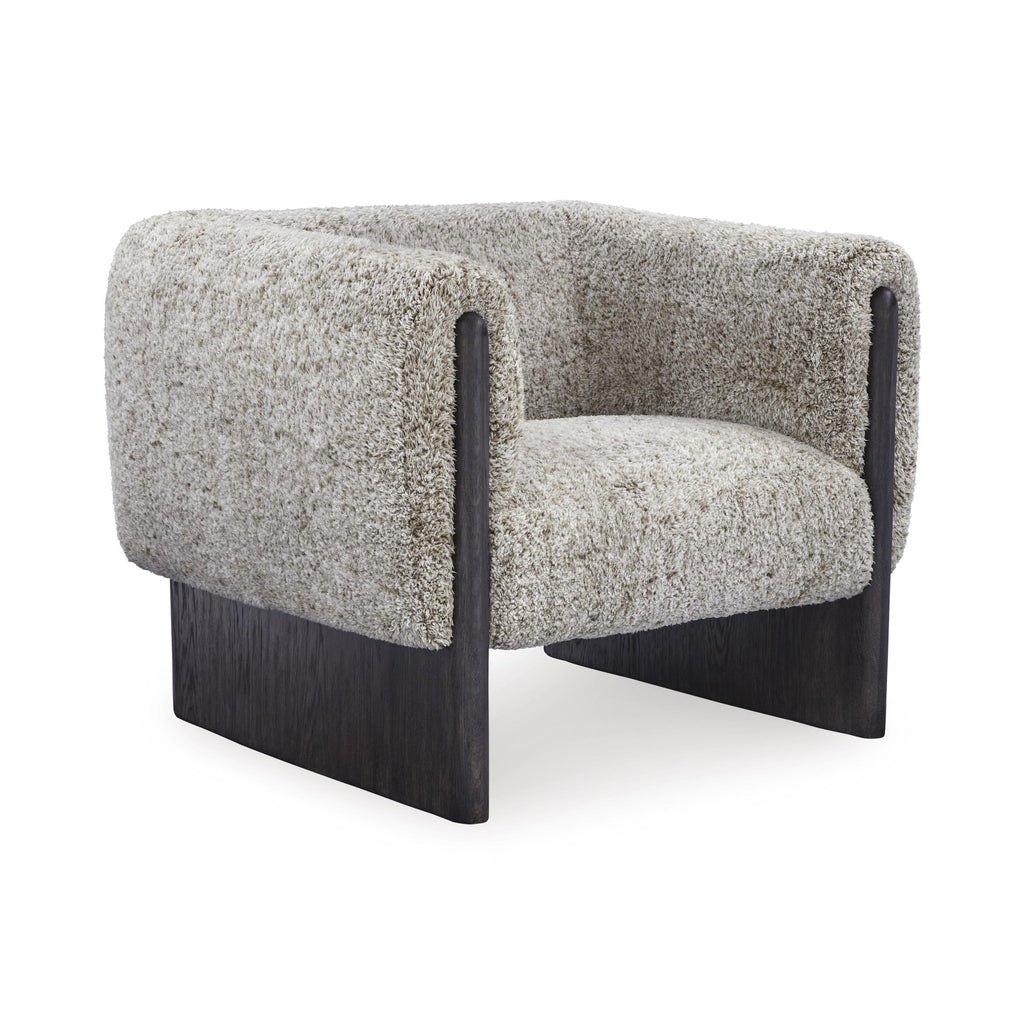 Decidedly contemporary in form, this accent chair is a statement-making addition to your home. Its cozy, ultra-soft faux shearling fabric... Decidedly contemporary in form, this accent chair is a statement-making addition to your home. Its cozy, ultra-soft faux shearling fabric creates a richly tactile lounging experience. Arms with espresso brown oak veneer extend to the base, lending an architectural appeal to the overall look. View more