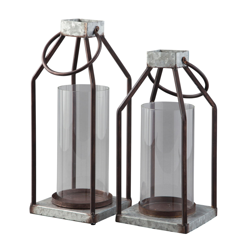 • Made of galvanized metal with antiqued finish and glass hurricane shade