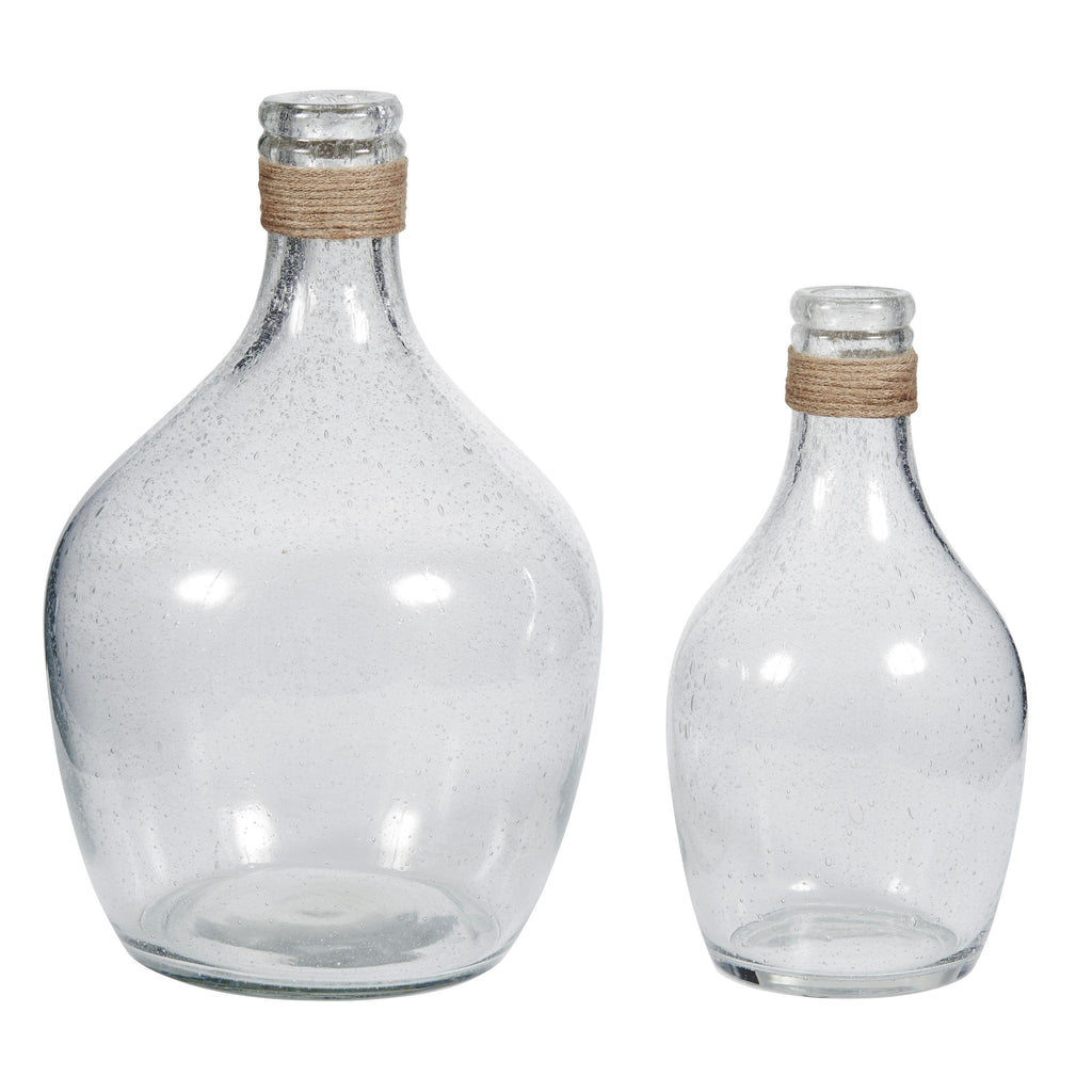 The versatility of this 2-piece vase set is a stylist’s dream. Light brown rope ties around the top of the... The versatility of this 2-piece vase set is a stylist’s dream. Light brown rope ties around the top of the bottleneck design, while a seeded finish brings texture to the clear glass. Drop in faux cotton stems for a vintage or modern farmhouse look. View more